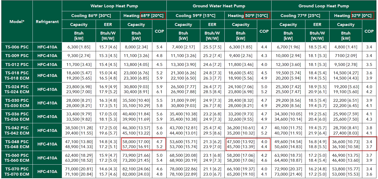 In this graphic, notice how you have Water Loop Heat pump, Ground Water Heat pump and Ground Loop Heat pump? Well if you look at the COP's, there is a big difference while comparing. The reason is simple: The EWT (Entering water temperatures) are higher in some categories which means that its energy source is different. Ground loop Heat pumps are for closed loop vertical and horizontal applications. Ground Water Heat pump category is for Open loop systems and Water loop heat pump is mostly for pond applications where it is rarely seen in the industry. What you will also notice is each model # has PSC or ECM attached to them. This refers to the type of blower fan motor in the system. ECM is most common and more efficient. In Step # 2, we determined the heat loss (33,600 btu/hr) and chose a Closed loop vertical system therefore we look at the ground loop heat pump column and find a COP of 3.7 for the TS-048 ECM model. Make sure you are comparing the right configuration as you would be surprised to find that some Geothermal installers do not fully understand how to read these charts and make the mistake of taking the brochure efficiency indicated which would most likely be the highest one they can achieve and in this case (5.2 COP).