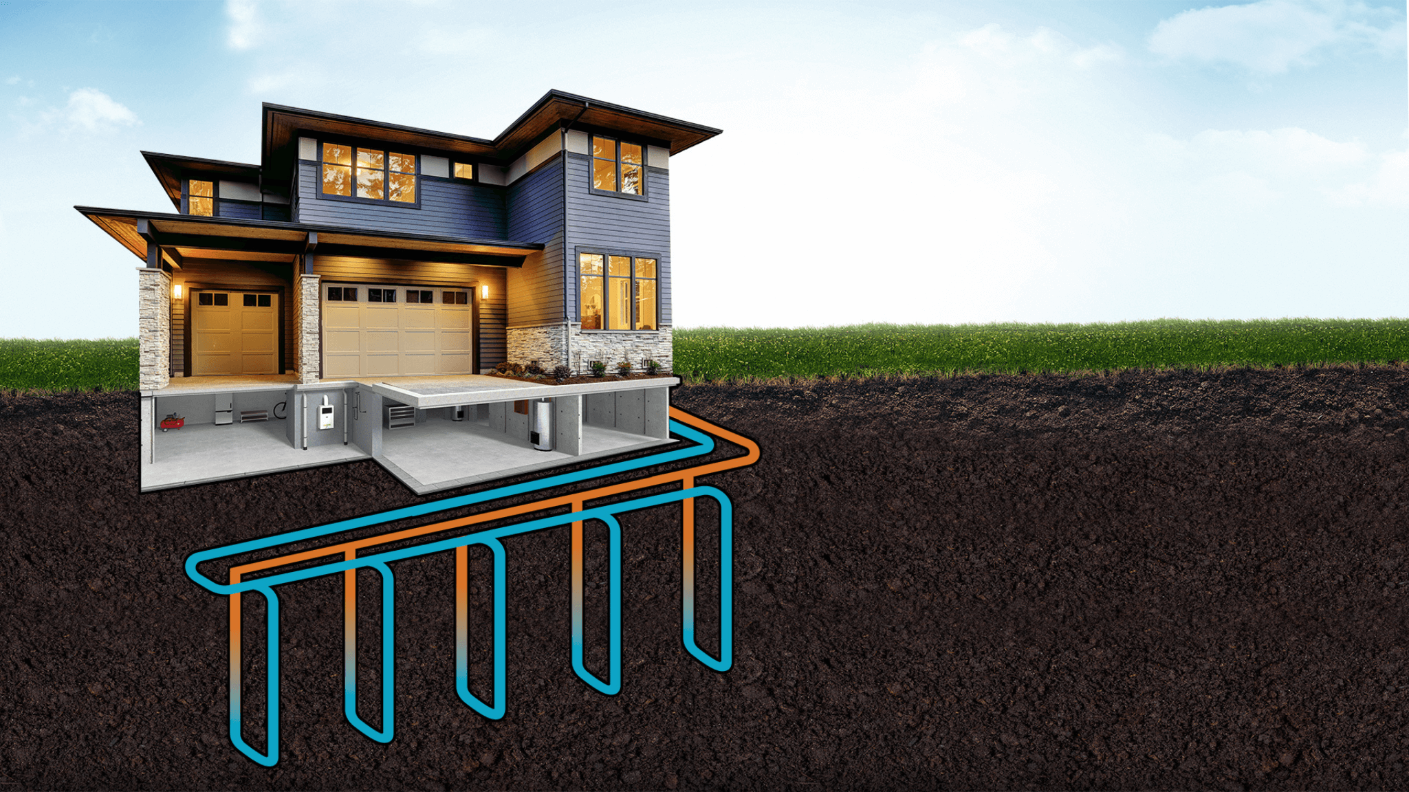Closed Loop: This system consists of drilling a 4 to 6" vertical hole, dropping down a continuous piping loop of 1" to 1.25" between 150' to 500' deep. The hole is then filled with a highly conductive grout product know as bentonite and sealed. This configuration does not rely on water as it absorbs energy directly from the ground where you have constant warm temperatures. You can also install horizontal loops AKA slinky's and this option will require extensive landscaping and digging.